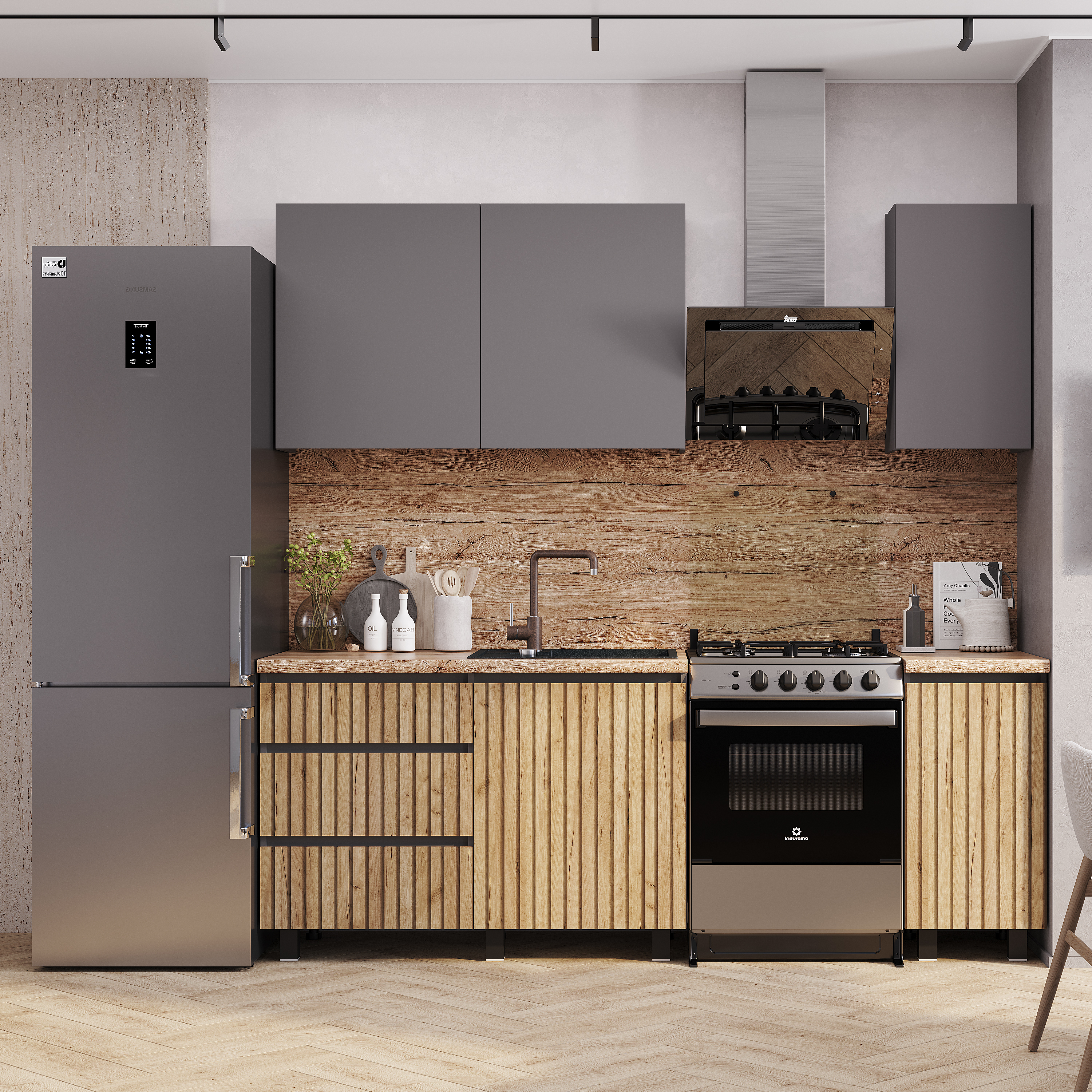 Универсальный дизайн кухни "Шерлок" легко адаптируется под различные интерьерные решения. Фотопечать "рейки" создает иллюзию фактурности. Высокие ножки позволяют без труда поддерживать чистоту на кухне с помощью робота-пылесоса.
