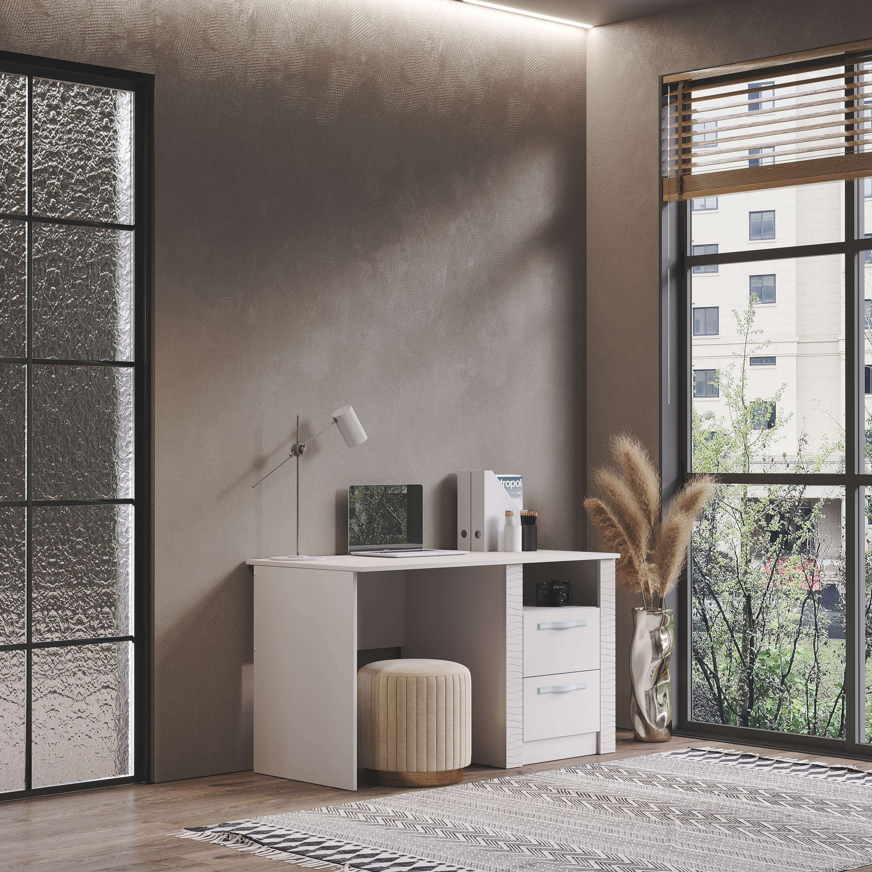 Стильный письменный стол "Монако" станет любимым местом для работы или учебы. Модель выполнена из высококачественной ЛДСП в цвете "кашемир". Фасады встроенной тумбы имеют отделку из МДФ. Помимо вместительной столешницы, в столе есть два выдвижных ящика и открытая ниша для хранения всех необходимых вещей.